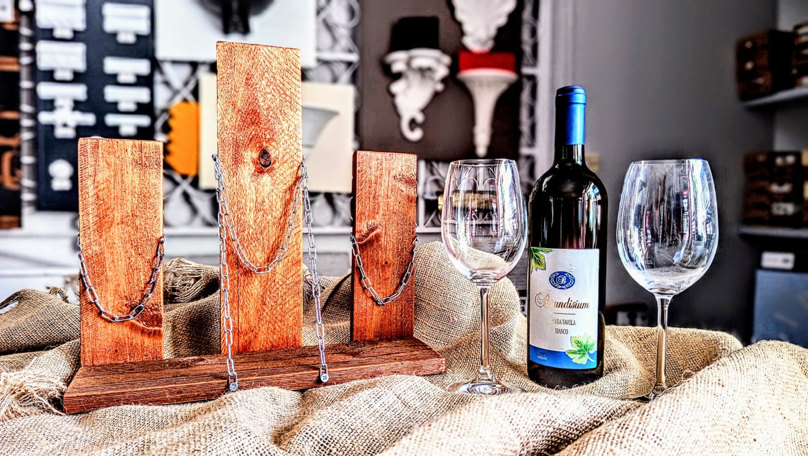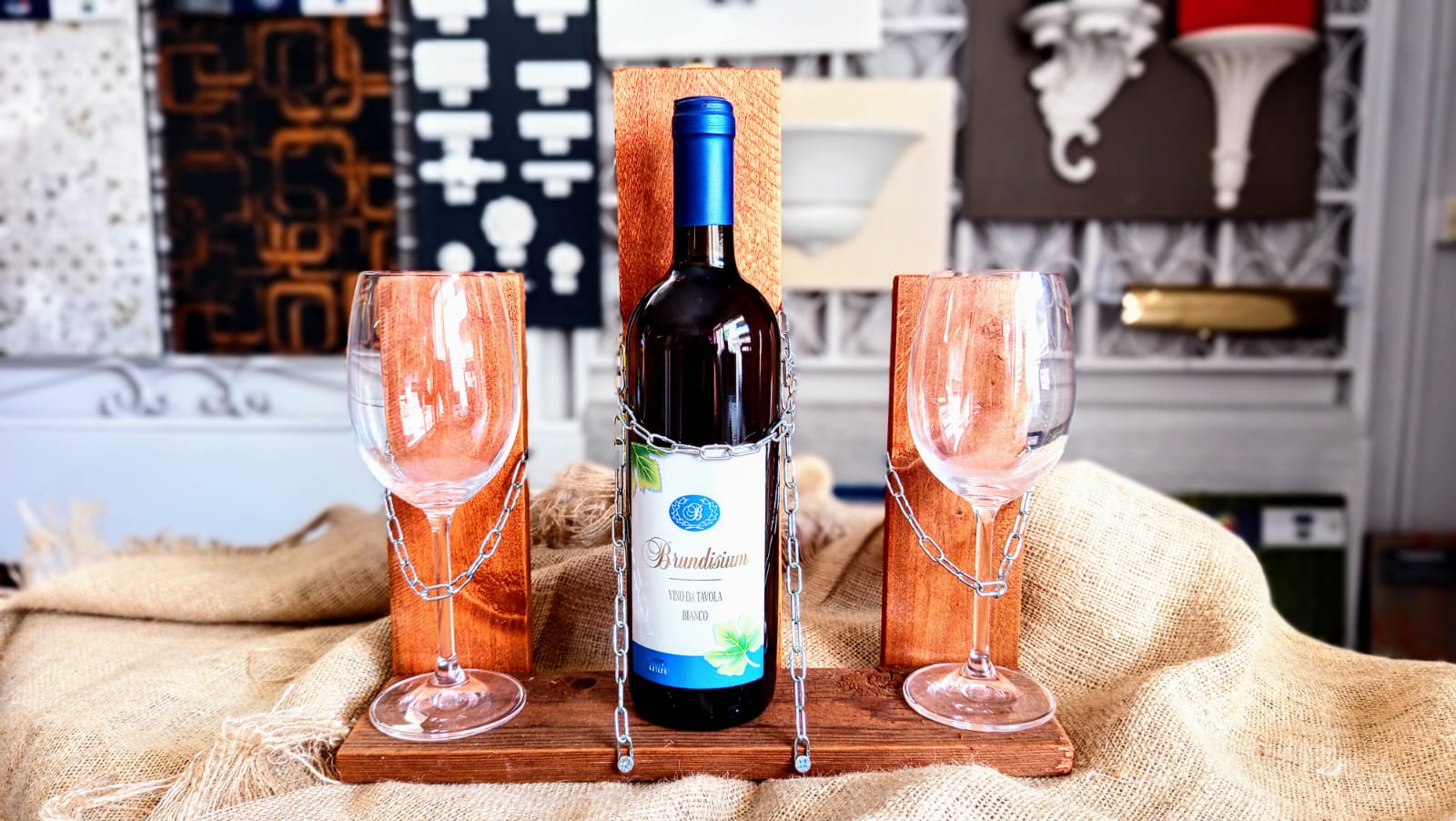 PORTA BOTTIGLIA CON CALICI Questo porta bottiglia in abete verniciato ciliegio unisce praticità e allegria: custodisce bottiglie e calici con una chiusura a catenella argentata che aggiunge un tocco giocoso e originale. Perfetto per rendere ogni brindisi più divertente e di stile!